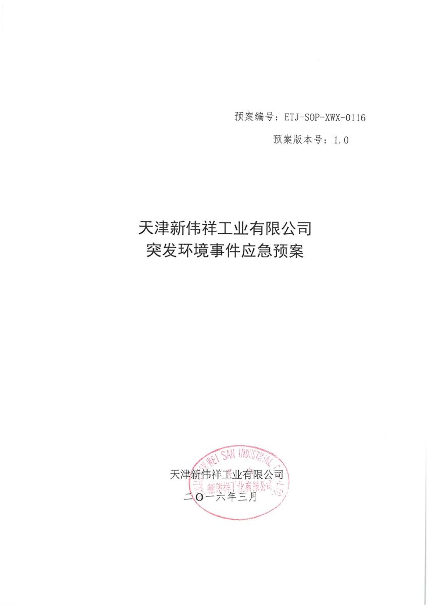 天津新偉祥工業(yè)有限公司突發(fā)環(huán)境事件應(yīng)急預(yù)案